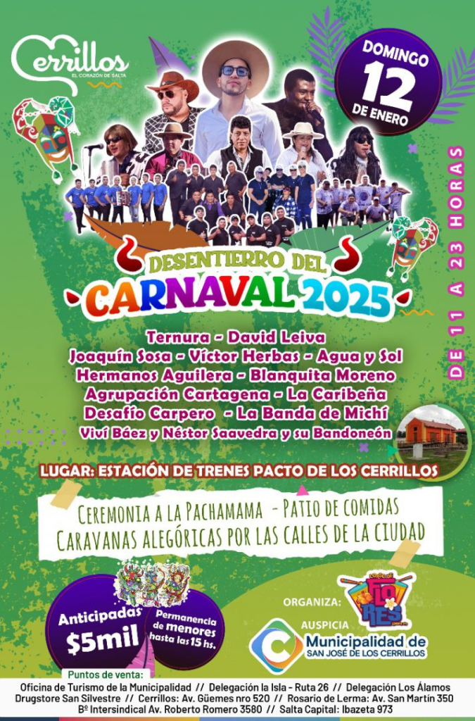 Este domingo 12 de enero, Cerrillos se convertirá en el centro de la festividad y la cultura salteña con el Desentierro del Carnaval 2025, un evento que promete llenar de música y color las calles de la localidad. La celebración se extenderá desde las 11 hasta las 23 horas en la Estación de Trenes Pacto de los Cerrillos.