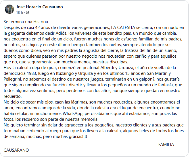 En el comunicado, la familia compartió que la decisión no fue fácil y estuvo motivada por la difícil situación económica del país y los cambios sociales y culturales. “Con un nudo en la garganta debemos decir adiós”, escribieron, destacando que, aunque las circunstancias han cambiado, los recuerdos que La Calesita ha creado para tantas familias perdurarán. El tradicional parque de diversiones, que abrió sus puertas en 1983 en la Peatonal Alberdi y Urquiza, se trasladó en diversas ocasiones y, en los últimos años, funcionó en San Martín y Pellegrini.