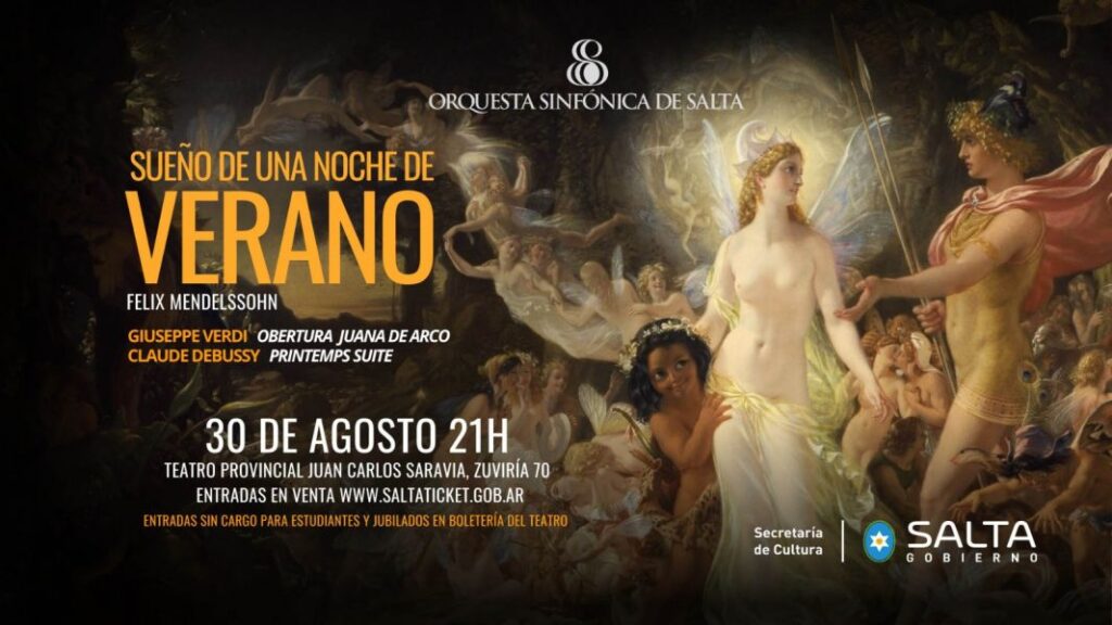 El repertorio de la velada será variado e interpretará obras destacadas del canon clásico. La Orquesta Sinfónica de Salta abrirá el concierto con la «Obertura de Juana de Arco» de Giuseppe Verdi, una pieza que captura el dramatismo y la intensidad de la heroína francesa. A continuación, se escuchará la «Printemps Suite» de Claude Debussy, que traerá al escenario la frescura de la primavera a través del estilo impresionista del compositor francés. La pieza central del programa será la suite de «Sueño de una noche de verano» de Felix Mendelssohn, una obra que fusiona música y literatura inspirada en la comedia de Shakespeare.
