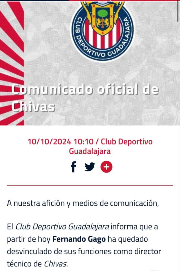 Chivas anunció oficialmente la desvinculación de Gago a través de un comunicado: “El Club Deportivo Guadalajara informa que a partir de hoy Fernando Gago ha quedado desvinculado de sus funciones como director técnico. En las últimas horas, Gago le comunicó a la directiva su decisión de volver a Argentina junto con su cuerpo técnico”. La institución también señaló que pronto anunciará a su nuevo entrenador.