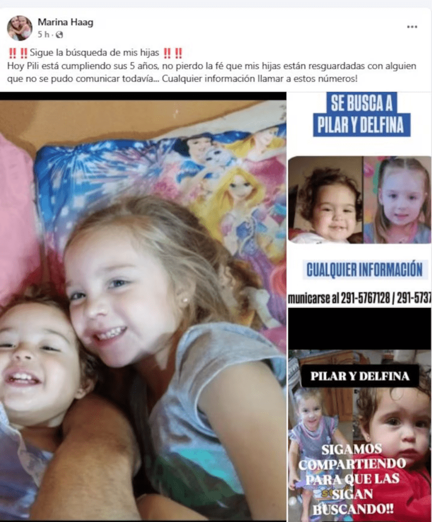 Marina Haag, madre de las niñas, compartió un emotivo mensaje en sus redes sociales, donde expresó su esperanza de que las niñas se encuentren a salvo. «Hoy Pili está cumpliendo 5 años. No pierdo la fe de que mis hijas están resguardadas con alguien que aún no se ha comunicado», escribió junto a fotos de sus hijas.