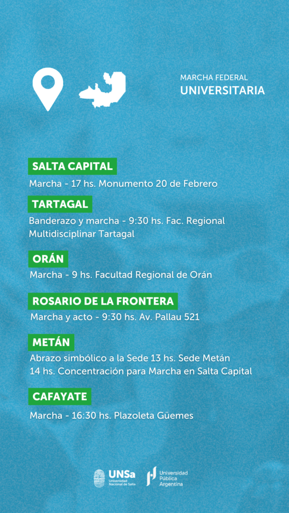 Este miércoles 2 de octubre, la Universidad Nacional de Salta (UNSa) se sumará a la Marcha Federal Universitaria, que se llevará a cabo en todo el país con el objetivo de defender las universidades públicas y la Ley de Financiamiento Universitario. La movilización, que en Salta comenzará a las 17 hs. desde el Monumento 20 de Febrero, reúne a diversas facultades y sedes de la universidad, además de organizaciones sociales y gremiales.
