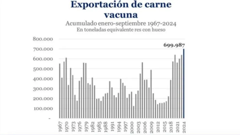 Las exportaciones de carne vacuna argentina han alcanzado cifras históricas, con un total de 699.987 toneladas equivalentes res con hueso exportadas entre enero y septiembre de 2024, lo que generó ingresos por 2.122 millones de dólares. Este es el nivel más alto registrado en los últimos 57 años, según la Secretaría de Agricultura, Ganadería y Pesca del Ministerio de Economía. El mercado internacional ha respondido favorablemente, con un fuerte crecimiento en destinos como Estados Unidos, Chile, Israel y la Unión Europea.