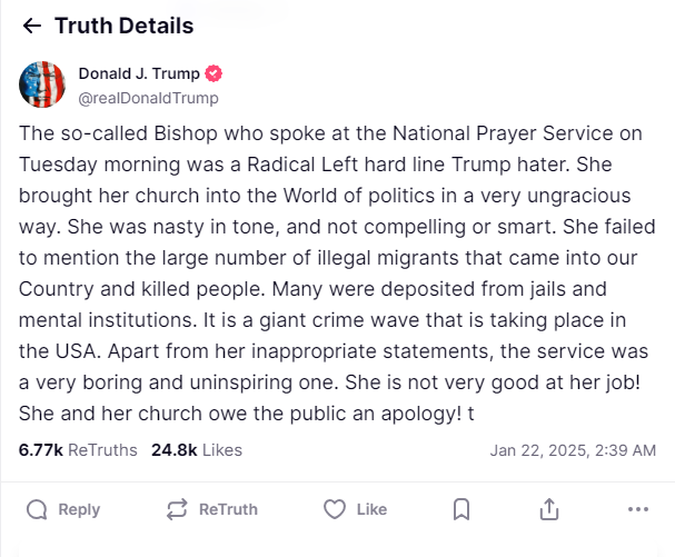 Trump, quien días antes firmó órdenes para iniciar deportaciones masivas de inmigrantes, no dudó en criticar a la obispa. “La llamada obispa que habló en el Servicio Nacional de Oración el martes por la mañana es una izquierdista radical y una odiadora de Trump” escribió el presidente en su plataforma Truth Social.