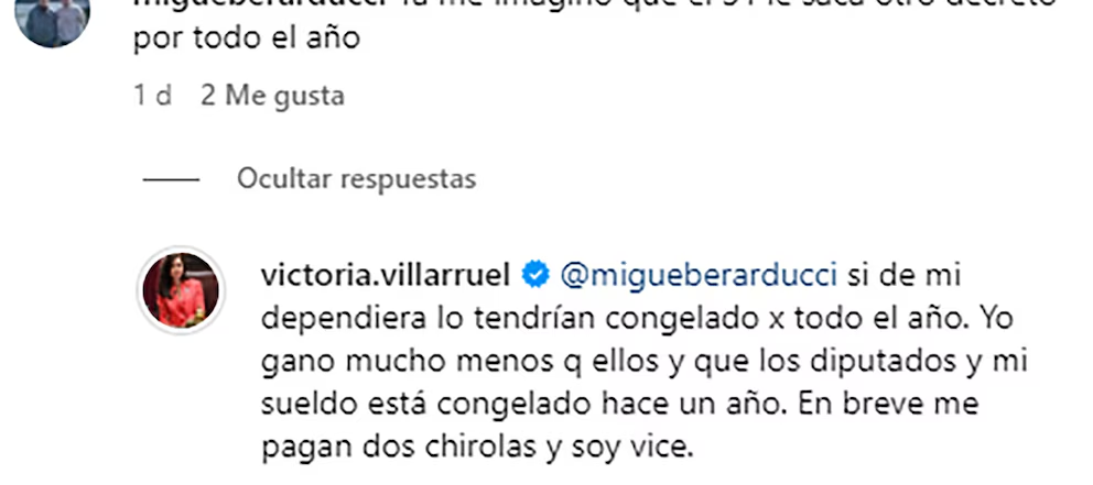 Victoria Villarruel no se guardó nada y, a través de su cuenta de Instagram, desnudó su malestar por el salario que percibe como vicepresidenta. En un fuerte descargo, afirmó que gana «menos que el presidente, los diputados, los senadores, ministros, jueces, diplomáticos, voceros» y hasta dejó claro que su sueldo está congelado hace un año. “En breve me pagan dos chirolas y soy vice”, sentenció, dejando claro su descontento con lo que considera un “desfasaje” en las dietas de los altos funcionarios.